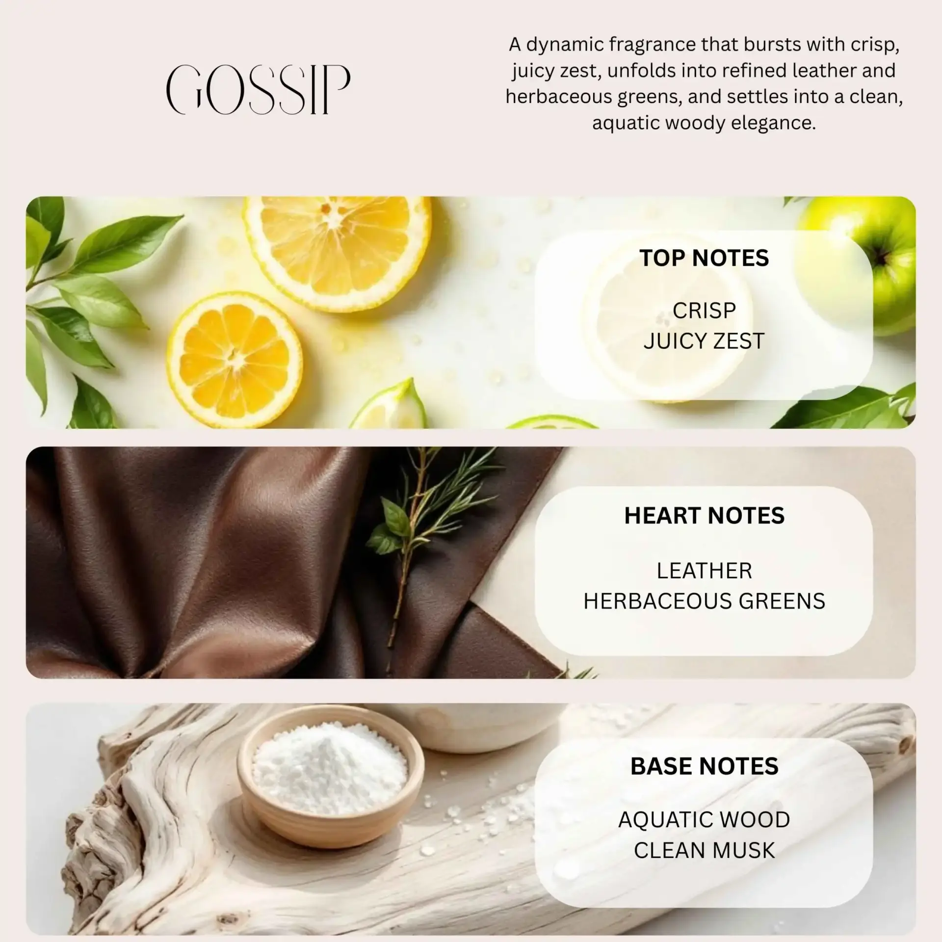 GOSSIP opens with a vibrant burst of grapefruit, lime zest, and airy aldehydes, delivering an energetic and refreshing start. The heart reveals aromatic lavender, rosemary, clary sage, and geranium, creating a crisp herbal freshness with refined elegance. The base settles into driftwood accord, cedarwood, and ambroxan, leaving a clean, aquatic-woody trail that feels modern, confident, and effortlessly fresh.
